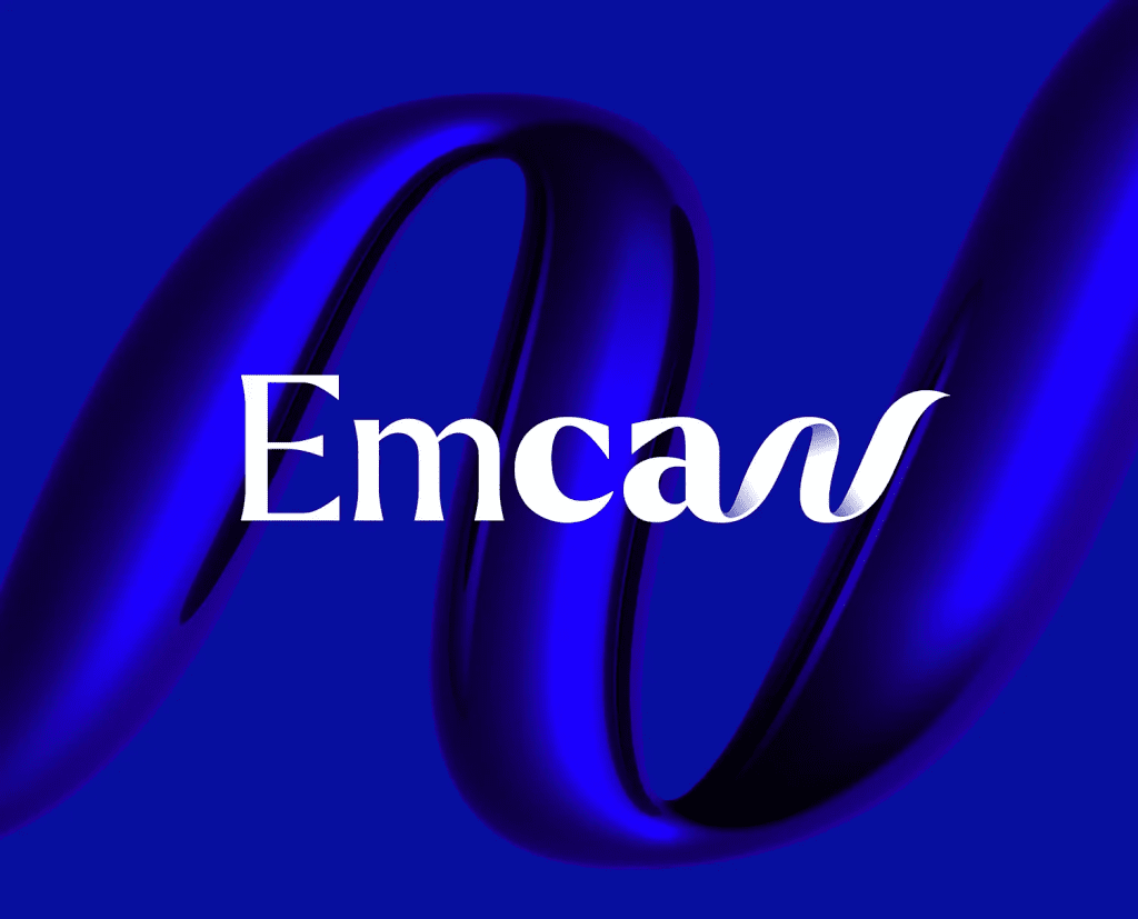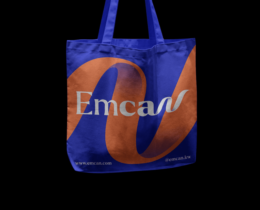 The redesigned Emcan logo is built around a fluid ribbon form, representing: